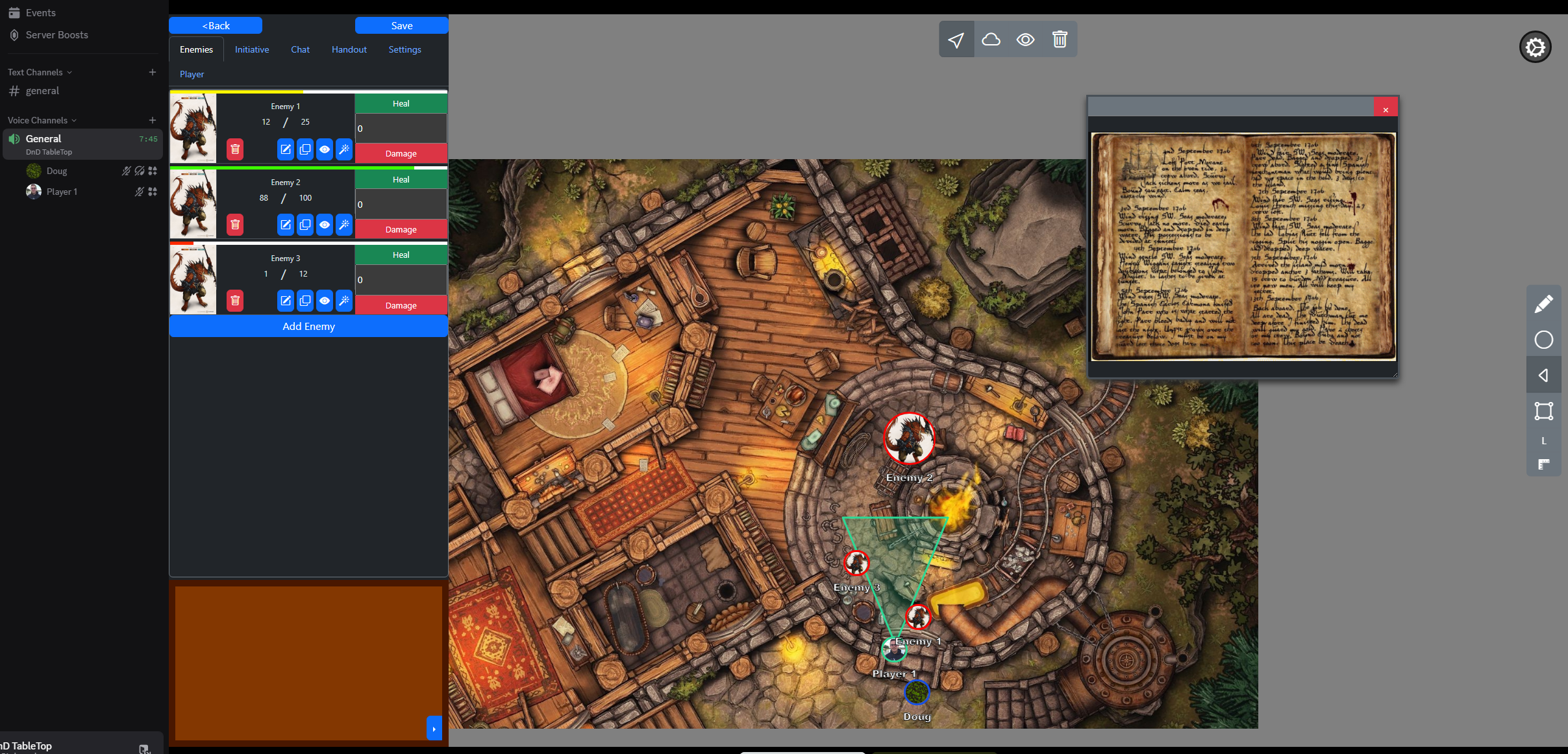 A real-time, Discord-embedded tabletop app built with React, Express, Colyseus, and Docker that streamlines D&D combat for remote campaigns. Players can manage combat, share handouts, and chat seamlessly in a fantasy environment. Designed to bring the tabletop experience to Discord, giving players more control and immersion without needing to meet in person.